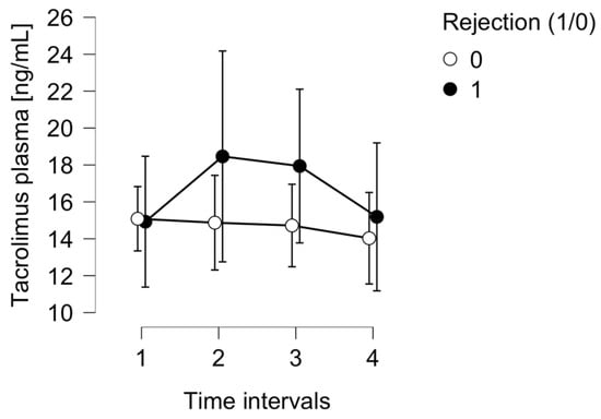 There were no significant changes in tacrolimus serum concentrations in the whole group (p = 0.017), nor between the rejection and non-rejection subpopulations (p = 0.554), as presented in Figure 2.