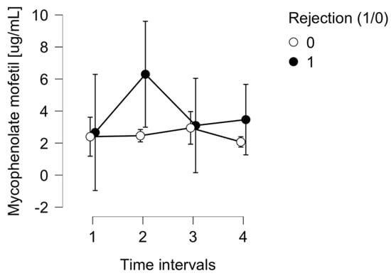 There were significant changes in mycophenolate mofetil acid serum concentrations within the whole group (p = 0.447) and also between rejection and non-rejection subpopulations (p = 0.059), as presented in Figure 3.