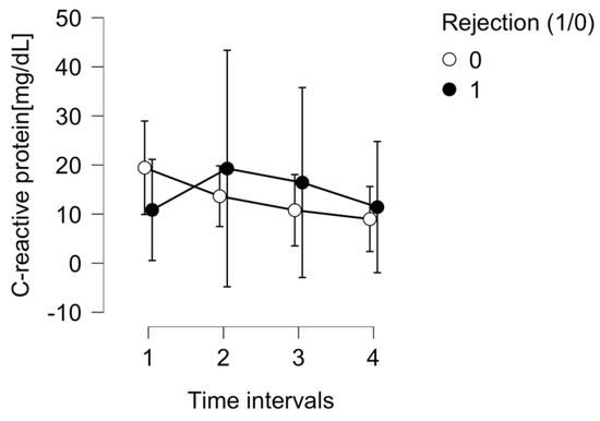 Inflammatory markers like C-reactive protein (CRP) were analyzed throughout the study period. They did not reveal any significant differences for ACR prediction between the rejection and non-rejection subgroups (p = 0.647), as shown in Figure 4.