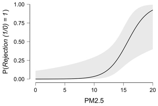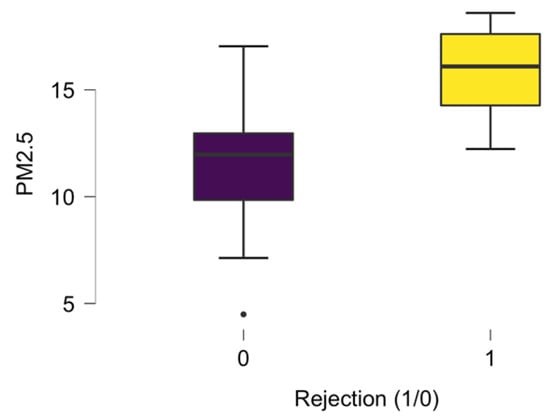 The air pollution exposure related to particulate matter PM2.5 was individually calculated for each heart transplant recipient. The mean values of the air PM2.5 concentration throughout the study period were examined and compared between both groups. A significant difference in PM2.5 exposure between the rejection group (16.10 (14.24–17.61)) μg/m3 and the non-rejection group (11.97 (9.85–12.97)) μg/m3 was noticed (p < 0.001) (Figure 5).