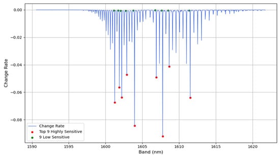 After identifying the highly sensitive wavelengths, the next step is to select appropriate insensitive wavelengths using variation rate analysis. Near the peak of the highly sensitive wavelength, the first derivative of the spectral absorption curve is calculated, and the wavelength with the smallest variation rate is chosen as the insensitive wavelength. These wavelengths are less influenced by CO2 absorption and better reflect the characteristics of background radiation or non-target absorptions. Finally, for each highly sensitive wavelength, nine insensitive wavelengths with the smallest variation rates, including 1607.555, 1603.786, 1601.415, 1611.837, 1602.364, 1601.744, 1606.721, 1602.722, and 1608.867 (nm), are selected to provide a sufficient background reference. This strategy of pairing sensitive and insensitive wavelengths enhances the robustness of the retrieval algorithm and improves its ability to correct for interference factors.