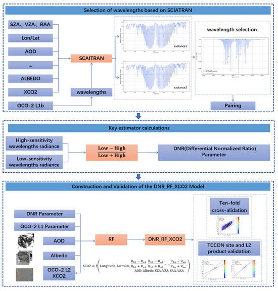 The flowchart of the XCO2 estimation with the aid of the DNR_RF_XCO2 approach developed in this study.