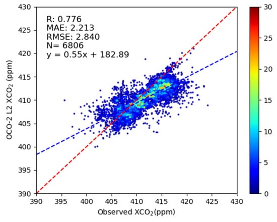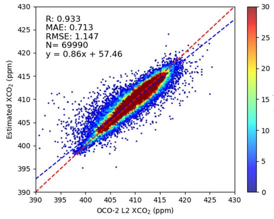 Results of the comparison between the retrieval results of 2020 and OCO-2 L2 products. The red dashed line represents the reference line y = x, and the blue dashed line indicates the fitted line of the scatter plot.