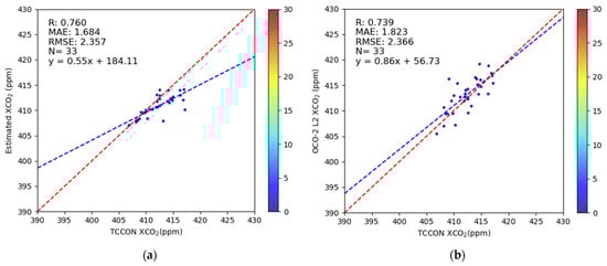 Comparison of retrieval results and OCO-2 L2 products with ground stations. (a) Comparison of retrieval results with the accuracy of ground stations; (b) Comparison of the OCO-2 L2 product with the accuracy of ground stations. The red dashed line represents the reference line y = x, and the blue dashed line indicates the fitted line of the scatter plot.