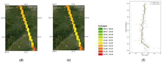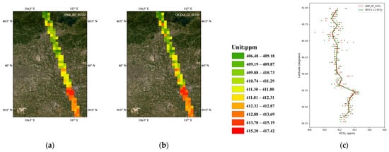 Figure 5a,b show the results indicate that the correlation between the OCO-2 retrievals and ground station measurements is 0.760, which is higher than the correlation between the OCO-2 L2 products and the ground stations. This suggests that the differential normalized ratio retrieval method effectively reduces the impact of systematic errors, thereby enhancing the model’s ability to capture observation signals. Furthermore, the retrieval method demonstrates greater adaptability to local climate conditions and atmospheric characteristics, resulting in more accurate CO2 concentration estimates. This improvement in accuracy not only validates the effectiveness of the retrieval method but also highlights its potential to enhance the accuracy of existing satellite products and facilitate ground-based observation validation.