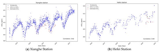 Several factors may contribute to the differences between retrieved XCO2 and ground-based observations at Xianghe and Hefei stations. First, the geographical location and climatic conditions of Xianghe station may favor higher retrieval accuracy. The region where Xianghe station is located may have more stable atmospheric conditions and better temporal matching, which improves the consistency of the retrieval results with the ground-based TCCON data. The lower correlation at Hefei station may be related to the local climate variability, aerosols, surface albedo, and other factors that may affect the retrieval accuracy [36,49].