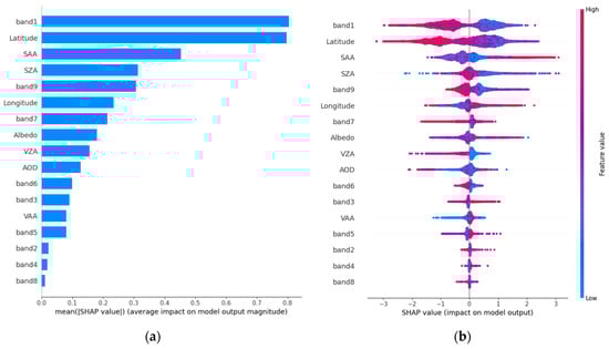 In the SHAP bar chart of Figure 9a, the wavelengths band1 and band9, Latitude, SAA, and SZA are listed as the five features that contribute the most to the model’s prediction results. This indicates that the model’s predictions primarily rely on these spectral and geometric characteristics. The high importance of wavelengths band1 and band9 might be related to the target variable being highly sensitive to the spectral absorption or scattering properties at these wavelengths, while the significance of latitude, solar azimuth angle, and solar zenith angle reflects the substantial impact of spatial distribution and lighting conditions on the target variable. The ranking of these features suggests that the model not only considers the spectral characteristics of the target variable but also fully integrates geographical and solar position parameters, achieving precise extraction of complex features from observational data.
