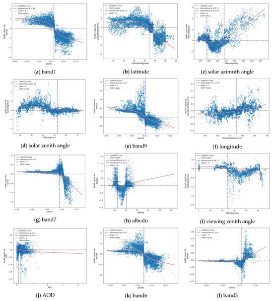 Figure 10 illustrates the trends and nonlinear relationships between feature values (band1, latitude, solar azimuth angle, and others) and their corresponding SHAP values. The results reveal how each feature contributes positively or negatively to the model’s predictions within specific value ranges. For a detailed analysis of each subplot, please refer to the figure caption.