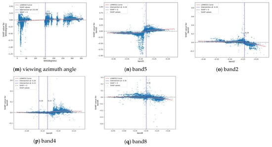 Sample dependence scatter plot showing the trends and nonlinear relationships between feature values and their corresponding SHAP values: (a) Band1: When the differential normalized radiance ratio at band1 is less than −0.24, the SHAP value is positive, indicating a positive impact on predictions. As the ratio increases, the SHAP value gradually decreases and becomes negative, reflecting a shift to negative influence. (b) Latitude: Similar trend to (a), demonstrating the transition from positive to negative SHAP values with increasing latitude. (c) Solar azimuth angle (SAA): At SAA = 197.70°, SHAP values transition from positive to negative, indicating increasing negative contribution. At SAA = 217.86°, SHAP values transition from negative to positive, indicating weakening influence. (d–q) Other features: Trends are analogous to (a–c), with SHAP values revealing the positive/negative contributions of features within specific value ranges.