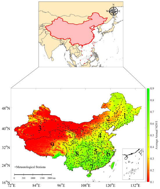 Study area covering nine large sub-regions: 1, Northeast China (NEC); 2, Inner Mongolia (IM); 3, Northwest China (NWC); 4, North China (NC); 5, Central China (CC); 6, Southeast China (SEC); 7, South China (SC); 8, Southwest China (SWC); and 9, the Tibetan Plateau (TP) with various normalized difference vegetation index (NDVI) ranging from 0.1 to 0.9. In this study area, 510 out of 756 meteorological stations (gray dots) with continuous instrumental meteorological records were selected.