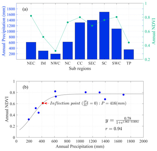 Explaining the spatial pattern of vegetation with various annual precipitation among nine sub-regions using the logistical function: (a) spatial difference in precipitation and NDVI; (b) the scatter plots of annual mean precipitation and NDVI fitted by the logical curve (, r2 = 0.88). In (b), the blue solid circles indicate the scatter points representing the relationship between annual precipitation and NDVI.