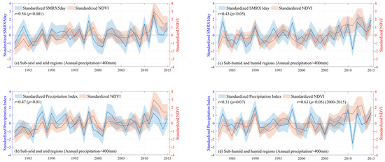 The relationship between standardized NDVI and climate indices from 1982 to 2015 in arid (a,b) and humid (c,d) regions. The shaded range in the four plots was estimated using .