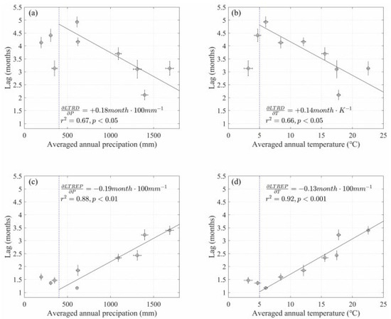 The marked gradients of LTRD with precipitation () or temperature () could be evaluated among various sub-regions. It was noted that the time-lagged response of vegetation to drought tends to be shorter in wet and warm regions (Figure 5a,b). For all the humid sub-regions, we further calculated the descending gradients of = −0.18 month·100 mm−1 with “wetting” (r2 = 0.67, p < 0.05) and = −0.13 month·K−1 with “warming” (r2 = 0.66, p < 0.05) using a simple linear regression model. The similar regional patterns of LTRD and LTREP suggested that both the LTRD and LTREP can reach 5-month-long time lags in the semi-humid region of Northeast China and 2-month-long time lags in the humid region of Southeast China.