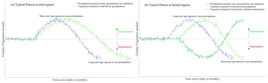 Conceptual models explaining the different responses of vegetation to drought and extreme precipitation. (a) Typical patterns in arid regions with a longer time lag in response to drought, but shorter time lag in response to extreme precipitation; (b) Typical patterns in humid regions with a shorter time lag in response to drought, but longer time lag in response to extreme precipitation. In the figures, the black dotted line represents the multi-year average state of vegetation or climate.