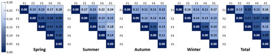 Spatial variability was calculated for the entire study period and seasons to identify temporal differences. The COD values for the entire study period ranged from 0.07 to 0.16 (Figure 2). Seasonal COD values were calculated as follows: spring (0.05–0.18), summer (0.10–0.15), autumn (0.07–0.24), and winter (0.08–0.17). All values were below the heterogeneity threshold of 0.3, indicating no significant spatial differences among the sampling sites during any period.