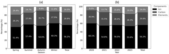 Analysis of the composition ratios of ionic, carbonaceous, and trace elemental components in PM2.5 showed that ionic components accounted for the highest proportion, ranging from 51.4% to 60.3% across all seasons and years, followed by carbonaceous components (27.9–35.7%) and trace elements (9.0–19.4%). These results are consistent with those of previous studies on the chemical composition of PM2.5 [66,67]. The seasonal composition ratios (Figure 4a) revealed clear variations in the proportion of trace elements, which were the highest in spring (19.4%), subsequently decreasing in summer (14.7%) and autumn (9.8%), and increasing again in winter (11.8%). The ionic components were most abundant in winter, whereas the carbonaceous components were most abundant in autumn. The annual composition ratios (Figure 4b) showed that the proportion of trace elements increased from 9.0% in 2020 to 18.0% in 2023. In contrast, the carbonaceous components maintained a consistent composition ratio of 28.3–31.5%. Meanwhile, no clear increasing or decreasing trends were observed for ionic components.