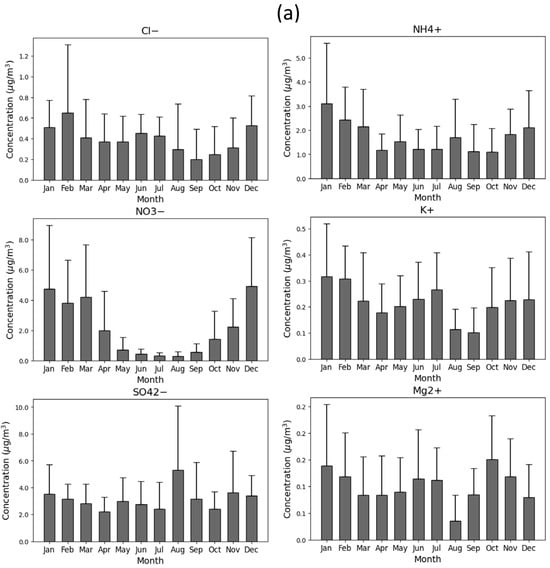 The monthly concentration trends of PM2.5 (Figure 6) show that among the ionic components, Cl−, NO3−, NH4+, K+, and Ca2+ exhibited high concentrations in winter (December–February), similar to PM2.5. NO3− showed the highest concentrations in December and January, likely due to reactions forming ammonium nitrate, which is promoted at relatively low temperatures [70]. In contrast, SO42− was the highest in August, likely due to photochemical reactions during summer, which promoted the formation of secondary sulfate [71]. The monthly concentration trends of carbonaceous components showed that EC and OC were the highest in winter (December–January), similar to PM2.5. EC and OC are known as representative indicators of vehicle emissions [72,73,74]. These findings are consistent with studies reporting that mobile emission sources contribute significantly to high concentrations in industrial complexes during winter [75]. Furthermore, the condensation of vehicle exhaust into smaller particles owing to low winter temperatures [76] contributed to high concentrations during this period.
