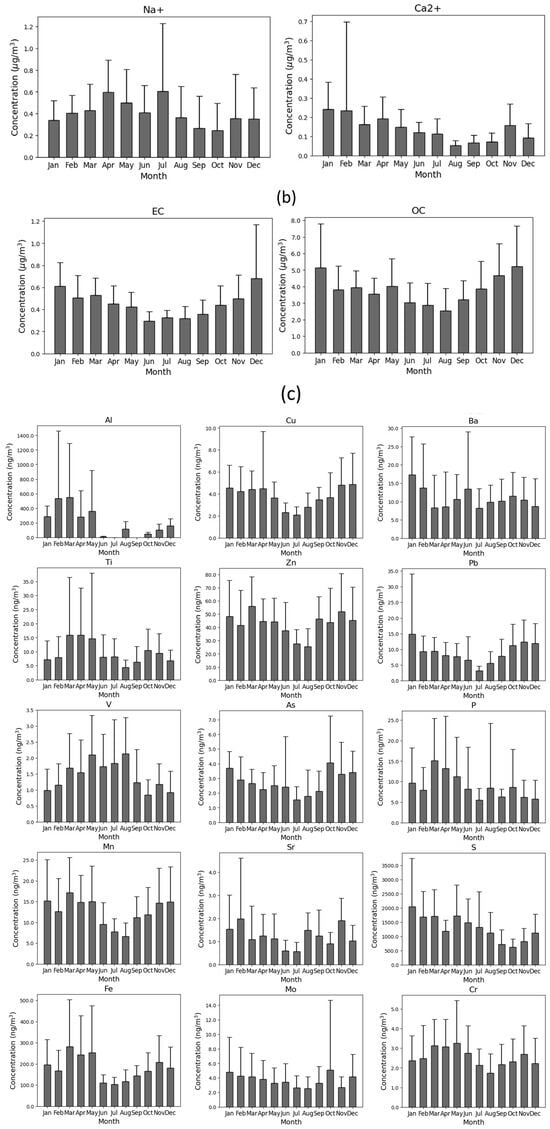 Monthly variations in the concentrations of (a) ionic, (b) carbonaceous, and (c) trace elemental components of PM2.5.