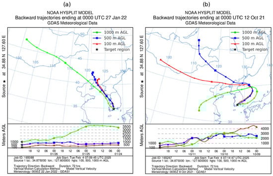Backward trajectory analysis results on (a) 27 January 2022 with the highest PM2.5 concentration and (b) 12 October 2021 with the lowest PM2.5 concentration.