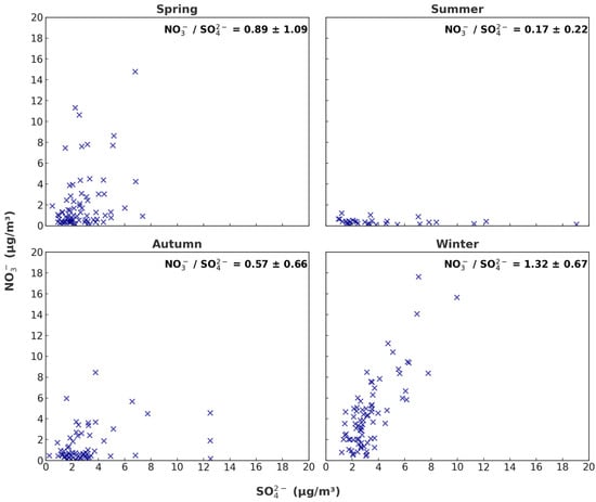 The characteristics of PM2.5 and its chemical components vary depending on emission sources. The mass ratio of NO3−/SO42− can reflect the relative contribution of mobile and stationary sources [89]. During the study period, the NO3−/SO42− ratio was found to be 0.85 ± 0.87, which was lower than those reported in Ansan and Siheung (2.08) [49] and Shanghai (0.86) [90]. This suggests that stationary sources, including coal combustion, were more dominant than mobile sources [91]. The seasonal variation in the mass ratio of NO3−/SO42− (Figure 8) followed the order Winter (1.32) > Spring (0.89) > Autumn (0.57) > Summer (0.17). However, such distinct seasonal differences in the NO3−/SO42− ratio can be influenced by various factors, including temperature and relative humidity [33,34]. Summer exhibited the lowest mass ratio, consistent with previous findings [92], which is likely due to seasonal characteristics that hinder NO3− formation under high temperatures and elevated RH conditions [93].