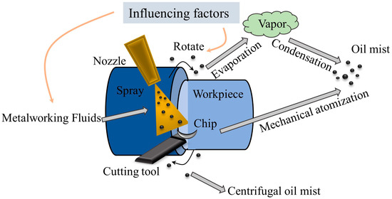 Industrial buildings often produce significant amounts of particulate matter, with pollution exceeding permissible limits being common due to varying processes across factories. In machining workshops, the particles are predominantly fine and harmful, with oil mist generation primarily attributed to evaporation/condensation, collision splashing, and centrifugal force [2,23], as shown in Figure 1. During machining processes, the oil undergoes partial evaporation due to exposure to heat sources such as frictional heat. This process causes oil molecules to transition into a gaseous state, forming oil vapor. As the oil vapor cools in the air, the initial stage of oil mist formation begins.