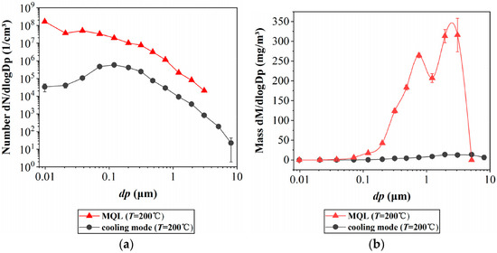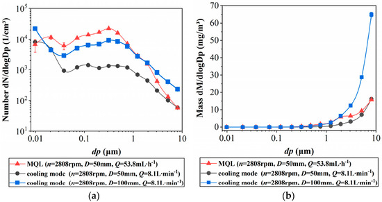 Oil mist without the generation of evaporation/condensation aerosol in minimum quantity lubrication mode and flood cooling mode: (a) minimum quantity lubrication by number, (b) comparison of size distribution by mass [26].