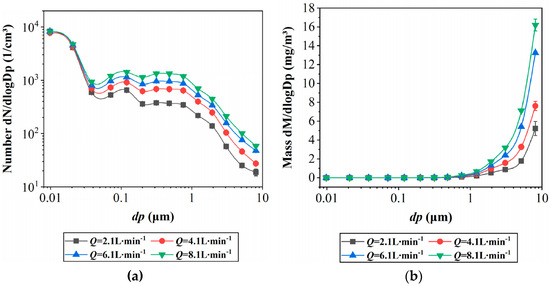 Figure 3 illustrates the impact on centrifugal aerosols when the flow rate of the metal cutting fluid is increased for a workpiece with a diameter of 5 cm. As the flow rate of the cutting fluid rises from 2.1 L/min to 8.1 L/min, the oil mist concentration steadily increases from 1.65 mg/m3 to 5.6 mg/m3. However, no changes are observed in the mass median diameter (MMD) and the Sauter mean diameter (SMD) of the particulate matter. Figure 3a visually demonstrates that the particle size distribution of the centrifugal aerosols remains nearly consistent across different flow rates, particularly within the range between 0.006 μm and 0.017 μm, where the particle count remains unchanged. The increase in oil mist mass concentration is primarily attributed to the elevation in the number of particles larger than 1 μm, as shown in Figure 3b. The cooling liquid flow rate is the most important parameter affecting the amount of oil mist dispersed, and the amount of oil mist dispersed is directly proportional to the flow rate of the cooling liquid.