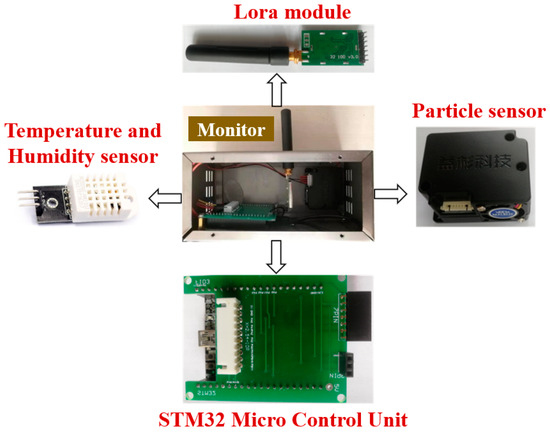 Integrating air quality data with airflow fields can better predict and track the propagation and diffusion of pollutants [60,61]. Sensors require on-site calibration to ensure monitoring accuracy [62], and placing monitors at a height of 2.5 m may lead to underestimations of pollutant concentrations [63]. Zhang [64] developed a real-time oil mist concentration monitoring system using a distributed network of low-cost sensors based on LoRa technology. Each monitor includes a temperature and humidity sensor, particulate matter sensor, LoRa wireless module, and a microcontroller (STM32F103C8T6), as shown in Figure 6. The microcontroller collects data from the sensors, which is transmitted from the sub-nodes to the main node via the LoRa module. After receiving the data, the LoRa module of the main node forwards it to the Sina Cloud platform for recording through a wireless transmission device.