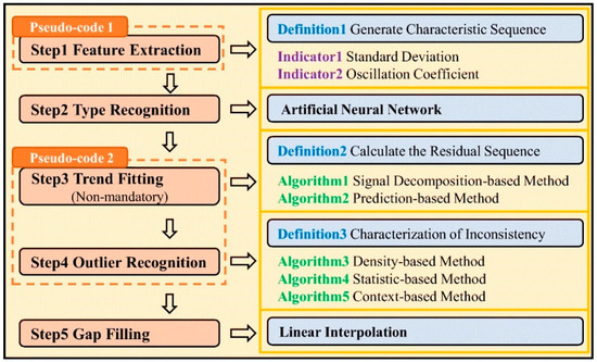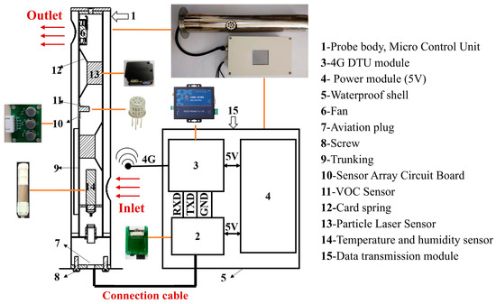 Zhang [65] designed a detachable low-cost oil mist probe with three parameters based on multi-sensor fusion technology. The probe mainly consists of the probe body and a data transmission module, as shown in Figure 7. The probe employs LoRa technology for data transmission. In practical applications, the probe demonstrates good stability during long-term monitoring, with outputs from multiple co-located sensors being consistent, effectively improving data quality. Additionally, Xu et al. [66] proposed an anomaly detection model framework for monitoring pollutants in industrial workshops, utilizing five independent core steps to address the fundamental task of outlier detection, as illustrated in Figure 8. The anomaly detection framework improves the accuracy of identifying anomalies in three typical data types to 70–90%, with anomaly detection and data quality enhancement outperforming other algorithmic combination strategies within the framework.