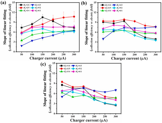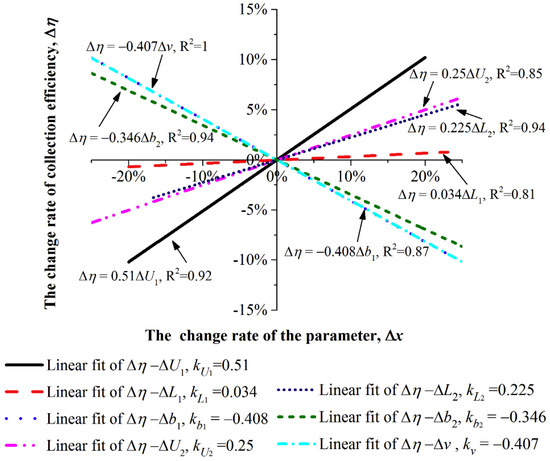 Due to the characteristics of electrostatic collection, the factors affecting its collection efficiency include the electrode configuration, charging stage voltage, length of the grounding plate in the charging stage, distance between opposite electrodes in the charging stage, voltage and electrode length in the dust collection stage, distance between opposite electrodes in the dust collection stage, and airflow velocity. Li et al. [73] analyzed the sensitivity of the collection efficiency to these factors and performed comparisons, as shown in Figure 10. “” and “” represent the change rate of this parameter and the corresponding efficiency, respectively. Based on the absolute values of the slopes of the fitted lines, the order of sensitivity is |kU1| > |kb1| > |kv| > |kb2| > |kU2|> |kL2| > |kL1|. Therefore, the factors affecting the collection efficiency, in descending order of importance, are: charging stage voltage (U1), distance between opposite electrodes in the charging stage (b1), airflow velocity (v), distance between opposite electrodes in the dust collection stage (b2), dust collection stage voltage (U2), electrode length in the dust collection stage (L2), and length of the grounding plate in the charging stage (L1). Consequently, in the design process of a two-stage ESP, the parameters should be considered in this order, but due to the presence of breakdown voltage in the charging stage, the voltage cannot be increased indefinitely.