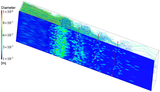 After oil mist particles enter the ESP, particles at the edges of the flow path first deposit on the inlet electrode plates. Most particles, however, will move along the flow lines under the combined effects of electric field force, gravity, and aerodynamic drag. When the airflow reaches the vicinity of the first corona line, secondary vortices will accelerate the airflow, changing its direction and bringing it closer to the dust collection electrode plate, as shown in Figure 11. During this process, some particles will directly deposit on the electrode plate aligned with the corona line, while a small number of particles will be drawn upstream by the vortex before depositing. The majority of particles will continue to move forward along the electrode plate, depositing when impacted by the skewed airflow. When approaching the second corona line, the secondary vortex effect will again alter the particle flow direction.