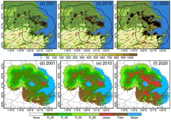 (a–c) Spatial distribution of urban surfaces from ESA-CCI land cover product (red shading) in 2001, 2010, and 2020 and terrain elevation (colored shading, units: m). Black dots (squares) represent the current urban grids (those in 2020), and the black line indicates the border of the YRD urban agglomeration. (d–f) Same as (a–c) but for urban grids (red), rural grids (green), topographic regions (brown), and water bodies (blue). The varying shades of green, from dark to light, represent rural grids located at distances of 20 km, 40 km, 60 km, and 80 km from the urban grids, denoted as R_20, R_40, R_60, and R_80, respectively. The locations of major cities in the YRD urban agglomeration, including Shanghai, Suzhou, Wuxi, Changzhou, Zhenjiang, Nanjing, Hangzhou, and Ningbo, are marked as SH, SZ, WX, CZ, ZJ, NJ, HZ, and NB in (f), respectively.