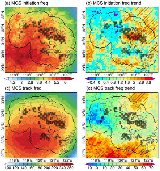 (a,b) Spatial distribution of the annual average MCS initiation frequency during 2001–2020 (units: h) and its trend (units: h·10a−1). Areas with significant trends (p < 0.1) are marked with stripes. (c,d) Same as (a,b) but for MCS track frequency (units: h) and its trend (units: h·10a−1). Black squares represent the urban grids in 2020, and the black line indicates the border of the YRD urban agglomeration.