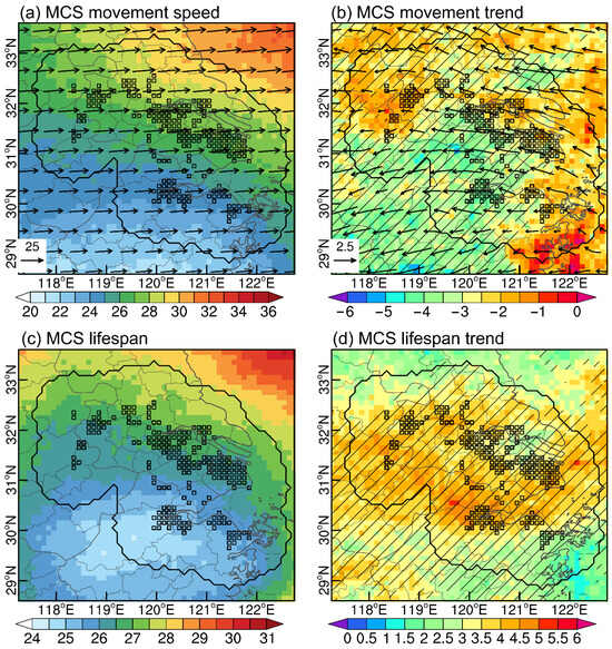 Same as Figure 2 but for (a,b) MCS movement speed (shaded, units: km·h−1 and km·h−1·10a−1, respectively) and direction (vector) and (c,d) MCS lifespan (units: h and h·10a−1, respectively).