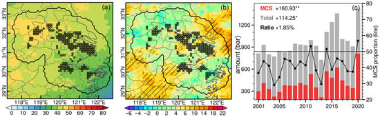 Spatiotemporal characteristics of MCS contribution to total precipitation. (a) Spatial distribution of the annual average MCS contribution to total precipitation (units: %) and (b) MCS contribution trend (units: %·10a−1). Areas with significant trends (p < 0.1) are marked with stripes. (c) Time series of total precipitation (gray bars, units: mm) and MCS-induced precipitation (red bars, units: mm), along with the proportion of MCS contribution (black line, units: %), from 2001 to 2020. Trend values are indicated in the top-left corner (* for p < 0.1, ** for p < 0.05).