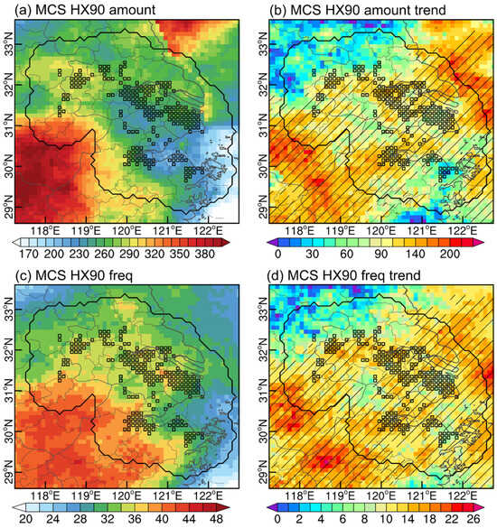In terms of trend characteristics, the trends in HX90 amount and frequency induced by MCSs are 23.6% and 41.1% higher, respectively, than those of total HX90 (Figure 6c,f). As shown in Figure 5b,d, the YRD region exhibits a significant positive trend in MCS-induced extreme precipitation, indicating an overall increase in MCS intensity in this area []. Additionally, urban agglomerations and the downstream areas also demonstrate substantial trends in HX90 amount and frequency. This preference for urban areas and their nearby rural areas may suggest that urban processes play a role in enhancing MCS-induced extreme precipitation.