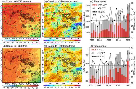 Same as Figure 4 but for MCS contribution to extreme precipitation. (a) Spatial distribution of the annual average MCS contribution to HX90 amount (units: %) and (b) its trend (units: %·10a−1). Areas with significant trends (p < 0.1) are marked with stripes. (c) Time series of total HX90 amount (gray bars, units: mm), MCS-induced HX90 amount (red bars, units: mm), and the proportion of MCS contribution (black line, units: %) from 2001 to 2020. Trend values are indicated in the top-left corner (* for p < 0.1, ** for p < 0.05). (d–f) Same as (a–c) but for HX90 frequency.