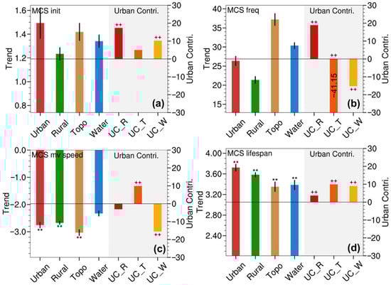 Trends in MCS activity characteristics across urban and non-urban regions and the urbanization contribution. (a) MCS initiation frequency (units: h·10a−1), (b) MCS track frequency (units: h·10a−1), (c) MCS movement speed (units: km·h−1·10a−1), and (d) MCS lifespan (units: h·10a−1). In each panel, the left four columns of bar plots represent trends in urban areas, rural areas, topographic regions, and water bodies, respectively. * (**) indicates trends at a 0.1 (0.05) significance level. The error lines represent the 95% confidence intervals based on the variations within each region. The right three columns show the relative differences between urban trends and those of rural areas, topographic regions, and water bodies, representing the urbanization contribution in Section 2.3 (units: %). Differences in trends between urban and non-urban regions are tested using Welch’s two-sample t-test and are marked with + (++) over the bars if p < 0.1 (p < 0.05).