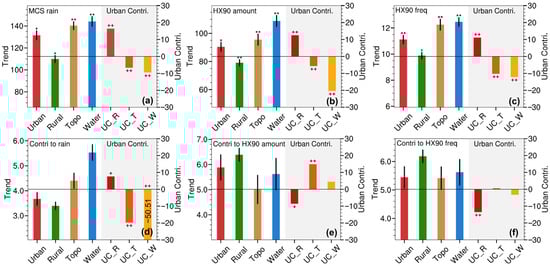 Same as Figure 7 but for trends in MCS-induced precipitation across urban and suburban regions along with the urbanization contribution. (a) MCS precipitation (units: mm·10a−1), (b) MCS HX90 amount (units: mm·10a−1), (c) MCS HX90 frequency (units: h·10a−1), (d) MCS contribution to total precipitation (units: %·10a−1), (e) MCS contribution to total HX90 amount (units: %·10a−1), and (f) MCS contribution to total HX90 frequency (units: %·10a−1). * (**) indicates trends at a 0.1 (0.05) significance level. Differences in trends between urban and non-urban regions are marked with + (++) over the bars if p < 0.1 (p < 0.05).