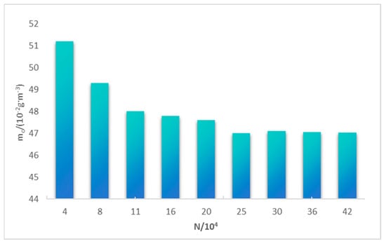 In general, the grid quality and density determine the calculation accuracy and efficiency. In order to ensure the accuracy of the calculation results and save the calculation cost as much as possible, this paper chooses the first group of simulations to verify the grid independence of the model. Among them, the influence of the number of grids on the quality of the ice cover is shown in Figure 2. It can be seen that the number of grids is more than 2.5 × 105, and the quality of the ice cover tends to be stabilized.