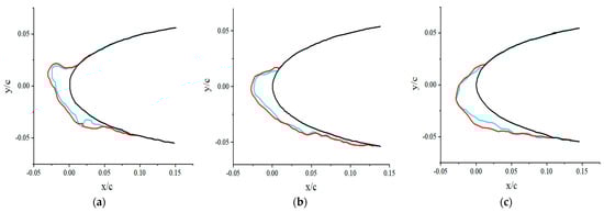 Using the above meshing method, three sets of numerical simulation results are compared with NASA test data as shown in Figure 3, where c is the chord length of the NACA0012 airfoil. As shown in Figure 5 (the black line represents the NACA 0012 airfoil, the blue line is the numerical simulation model, and the red line is the NASA experimental model), when the temperature is −5.56 °C, a liquid droplet does not freeze immediately when it hits the surface of the airfoil, and under the influence of the incoming flow, the water film moves upward and freezes gradually, forming an upwardly curved ice corner at the leading edge of the airfoil, which is in a state of open ice, with an irregular ice shape, which has a greater impact on the aerodynamic performance of the airfoil. When the temperature is −11.11 °C, the upward ice corner phenomenon is weakened, and the overflow phenomenon at the bottom of the airfoil is more serious, and it is in a state of mixed ice. At −26.11 °C, the liquid droplets freeze immediately when touching the surface of the airfoil, and almost no water droplets move upward with the airflow. Therefore, at lower temperatures, the overlying ice is in the form of rime ice and the ice pattern is more consistent with the aerodynamic design of the airfoil and has less impact on the aerodynamic performance of the airfoil.