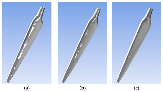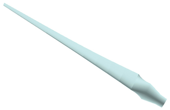 From the above analysis, it was found that the accuracy of the numerical simulation in terms of the calculation of wing icing is relatively high. So, this paper uses a numerical simulation to analyze the influence of different environmental factors on the surface icing of wind turbine blades. The target blade is a 2 MW wind turbine blade, and the relevant geometric parameters are shown in Table 3. The blade is composed of an S-shaped airfoil, which has a larger wind energy utilization rate and lower roughness requirements and is widely used in the selection of wind turbine blades. The wind turbine blade is shown in Figure 6.