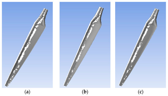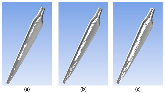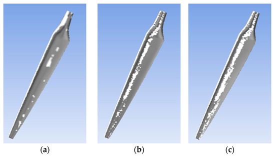 Distribution of blade surface ice cover at different liquid water contents: (a) 1 g/m3; (b) 2 g/m3; (c) 3 g/m3.