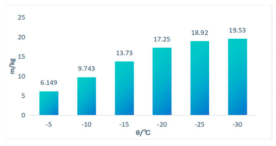 As can be seen in Figure 7, with the gradual decrease in ambient temperature, the ice-covered area on the blade surface shows an overall expansion trend, and the thickness of the ice-covered area at the leading edge of the blade thickens significantly with the decrease in temperature. The maximum thickness of ice cover at the leading edge of the blade is 1.290 mm at −5 °C, and the maximum thickness of ice cover at the leading edge is 29.23 mm at −30 °C. As can be seen in Figure 8, the temperature has a greater influence on the quality of ice cover on the blade surface when the ambient temperature is above −20 °C, and the average increase in ice cover quality is 3.700 kg for every 5 °C decrease. As the temperature continues to decrease, when the ambient temperature is below −20 °C, the temperature has a greater influence on the quality of ice cover on the blade surface, and the average increase in ice cover quality is 3.700 kg for every 5 °C decrease. As the temperature continues to decrease, when the ambient temperature is lower than −20 °C, the influence of temperature on the quality of the ice-covered blade surface gradually decreases, and the average increase in ice-covered mass is 1.140 kg for every decrease of 5 °C. This is because the liquid water content is constant. When the ambient temperature is above −20 °C, decreasing the temperature raises the collection rate of water droplets on the blades, and the content of the remaining liquid water in the air decreases. When the temperature is lower than −20 °C, decreasing the temperature cannot obviously improve the collection rate of water droplets, resulting in an increase in the ice-covered mass rate, resulting in a slower increase in the mass of the ice cover.