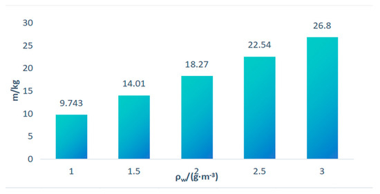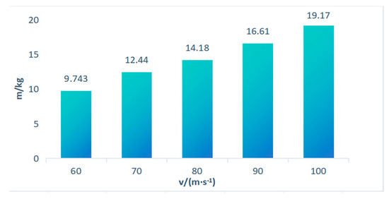 As can be seen in Figure 10, with the increase in the incoming rate and other steps, the mass of ice cover on the surface of the wind turbine blade also increases linearly, and the mass of ice cover grows by 2.357 kg on average for every increase of 10 m/s in the incoming rate. The main reasons are: (1) The increase in the relative rate between the blade and the incoming flow makes the air flowing past the blade per unit of time increase. In icing conditions, the frequency of the super-cooled droplets impacting the blade increases, resulting in a gradual increase in the amount of ice cover. (2) The increase in the relative rate between the super-cooled water droplets and the blades leads to an increase in the ice-covered area on the surface of the blades.