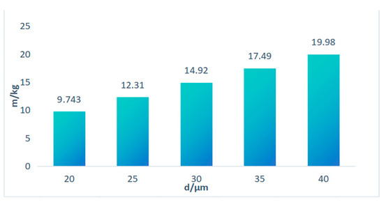 There is a significant difference in the inertia of water droplets with different diameters, and the distribution of ice cover is different after the impact of water droplets and the blade surface. Meanwhile, under the same liquid water content, the increase in water droplet diameter also reduces the density of the water droplets. In this paper, the five droplet diameters of 20, 25, 30, 35, and 40 μm were selected for the ice cover simulation, which, respectively, correspond to group 2 and groups 15–18 in Table 3. After 900 s of the numerical simulation of ice cover, the distribution and mass change in the ice cover on the blade surface are shown in Figure 13 and Figure 14.