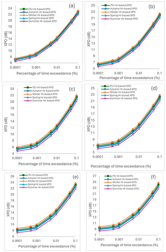 The variation in the XPD across the four seasons is evidently influenced by the seasonal rain heights, albeit with minor differences. The curves in Figure 2a–f indicate that XPDs attain minimal values during the summer season at all frequencies. This is because the summer season is a period characterized by frequent convective rainfalls and maximum rain height in Pretoria, during which rain-induced attenuations attain their peak as reported by Lawal et al. [13]. The intense convective rainfall increases rain-induced attenuation, thereby causing a reduction in XPD. The spring season is a transition period when rainfall and rain height reduce gradually, leading to lower attenuation and a consequential increase in XPD. Rain heights and rain-induced attenuation reach the minimal values in the winter, which results in maximum XPDs as depicted in Figure 2a–f. The low values of rain-induced attenuation during the winter and spring indicate rare rainy events that are usually less intense or involve fewer non-spherical raindrops that could cause depolarization. The maximum XPD, which occurs in the winter, is followed by a gradual decrease during the autumn season, which signifies a transition between the winter and summer. A comparison of the XPD obtained using the annual mean rain height of 4.54 km recommended by ITU with the seasonal XPDs for the study location revealed that the ITU Hr-based XPD slightly underestimates XPD during winter and overestimates during summer, spring, and autumn seasons at various frequencies. These observations agree with the findings of Sen and Singh [25], who applied maximum and minimum rain heights to compute XPD due to rain in Madras, India. From Figure 2a, which presents XPD distribution at 11.7 GHz transmission, it could be observed that at 0.01% of the time, the summer, spring, winter, autumn, and ITU XPDs are 13, 14, 15, 14, and 14 dB, respectively. These represent percentage differences of 7.7%, 0%, 6.7%, and 0% in the summer, spring, winter, and autumn with respect to the ITU XPD of 14 dB. Similarly, at 35 GHz, for the same time percentage of signal unavailability, the summer, spring, winter, autumn, and ITU XPDs are 14, 15, 16, 15, and 16 dB, respectively. These translate to higher percentage differences of 14.3%, 6.7%, 0%, and 6.7% in the summer, spring, winter, and autumn, respectively. The increase in the percentage differences as the frequency increases, especially in the summer, obviously indicates that the effects of rain height variability on XPD are minimal at low frequencies but become significant at higher frequencies.