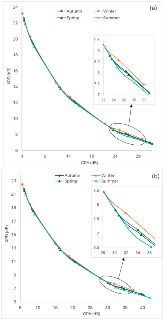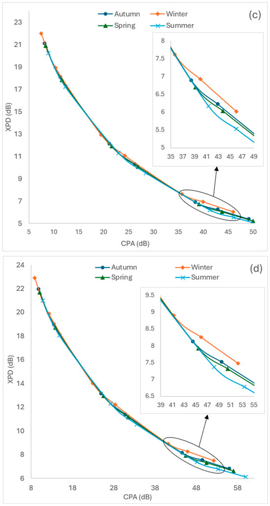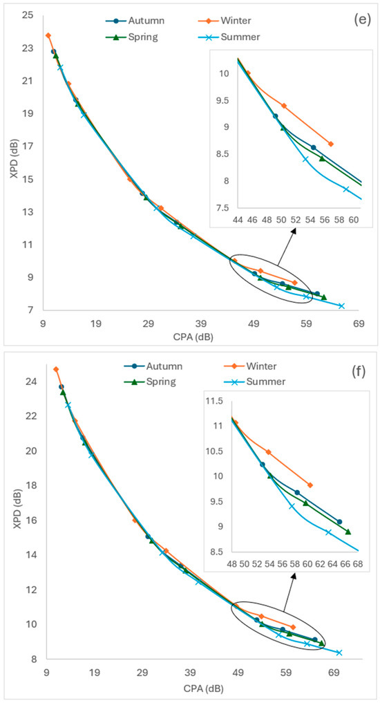 It could be observed from the curves that low values of seasonal CPAs have negligible effects on the seasonal XPD, but notable impacts are evidence at high CPAs. Figure 3a–f show that rain height variability has noticeable impacts on 11.7 GHz, 15 GHz, 20 GHz, 25 GHz, 30 GHz, and 35 GHz radio links when the CPA exceeds 22 dB, 32 dB, 41 dB, 48 dB, 53 dB, and 58 dB, respectively. Hence, special attention must be focused on the XPD of high-frequency signals whose demand is continuously growing due to its several advantages.