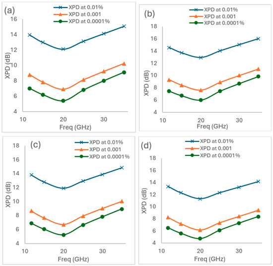 The dynamic relationship between XPD, frequency, and seasonal rain attenuation in Pretoria was also studied. Seasonal rain-induced attenuations at 0.01%, 0.001%, and 0.0001% of time were selected to investigate the effects of frequency on XPD. XPD generally decreases as the frequency increases from 10 GHz to about 20 GHz, showing that maximum XPD could be attained around 10 GHz as depicted in Figure 4a–d. However, XPD begins to increase with increasing frequency after the dip, resulting in higher values at frequencies above 30 GHz.