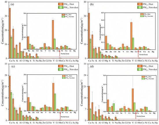 As illustrated in Figure 2, the concentrations of inorganic elements in PM2.5 exhibit a consistent seasonal pattern under both dust and non-dust conditions, following the order of spring > summer > autumn > winter. The descending order of these elements is Ca > Fe > Al > K > Cl > Mg > S > Na > Ti > Mn > Ba > V > Zn > Cu > Cr > Ni > Sn > Co > Cd > As > Hg. Notably, the content of inorganic elements in particulate matter is significantly higher during dust events compared to non-dust periods. Crustal elements, such as Ca, Fe, K, Al, Mg, Na, and Ti, dominate fine particulate matter, with average concentrations exceeding 0.81 μg/m3. This concentration is notably higher than in other regions [18,19], likely due to elevated emissions of coarse particulate matter from sand and soil under dry, dusty conditions in Xinjiang, China [20].